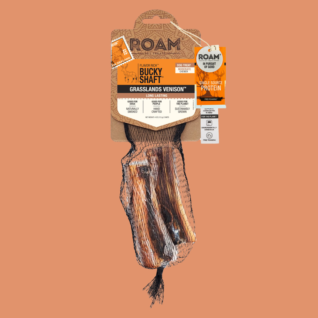 A premium, all–natural chew made from high–quality venison. This novel protein treat is perfect for dogs with common protein sensitivities, offering a delicious and nutrient–rich alternative. Designed to satisfy natural chewing instincts, it promotes dental health while providing long–lasting enjoyment. Ethically sourced and free from artificial additives, this savory chew delivers a wholesome and guilt–free indulgence. Give your furry friend a taste of adventure with the Roam® Woodlands Venison Shaft!